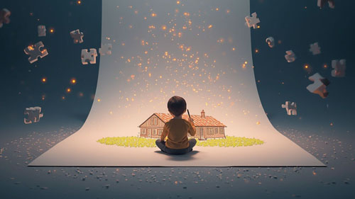 Of course, the child has learned what a house looks like. They begin transforming those white pixels into colorful ones with their pencils.